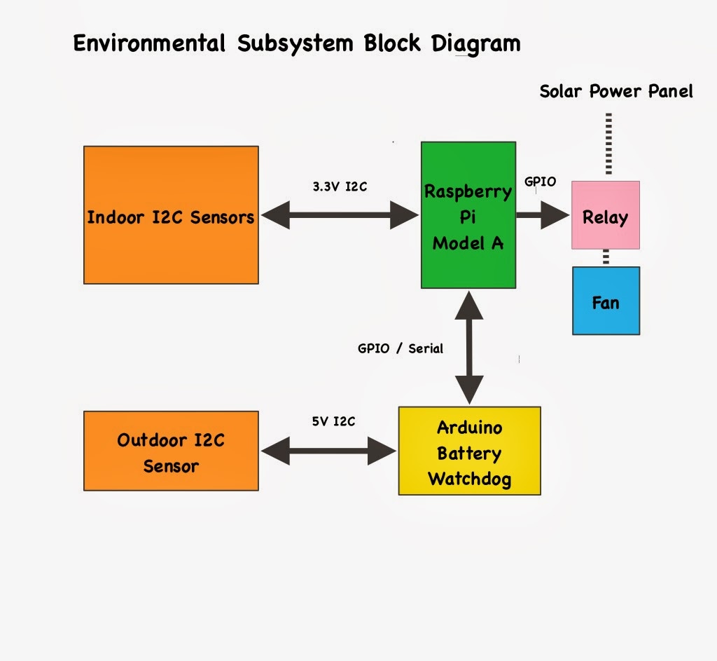 Project Curacao consists of four subsystems. A Raspberry Pi Model A is the brains and the overall controller. The Power Subsystem consists of LiPo batteries and charge management.  The Environment Sensor Subsystem has in-box temperature, outside temperature, luminosity, barometric pressure and humidity sensors. The Raspberry Pi Camera Subsystem contains a Raspberry Pi Camera and a servo motor controlling the cap over the camera to keep salt spray off the camera lens.